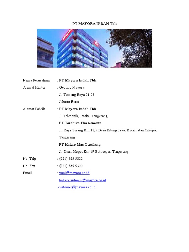 Mayora memiliki kantor pusat yang beralamat di gedung mayora. Mayora indah, tbk adalah perusahaan yang bergerak di bidang pengolahan makanan dan minuman. The company operates in three segments: Hingga saat ini, mayora dan anak usahanya tetap. The ministry of industry republic indonesia monitors the strategic sector.